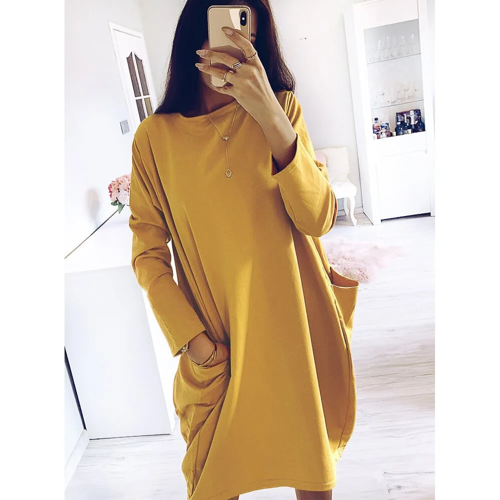 Осенне-зимнее женское Повседневное платье с круглым вырезом и длинным рукавом, свободное платье-туника с карманами