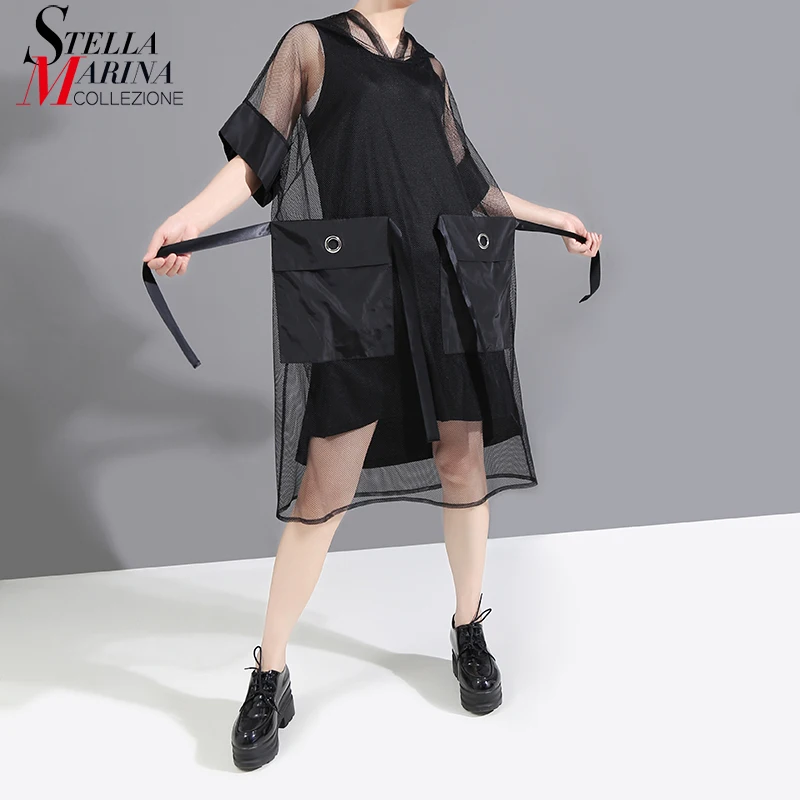 Женское Сетчатое платье с капюшоном, черное прозрачное платье большого размера с коротким рукавом, 6319