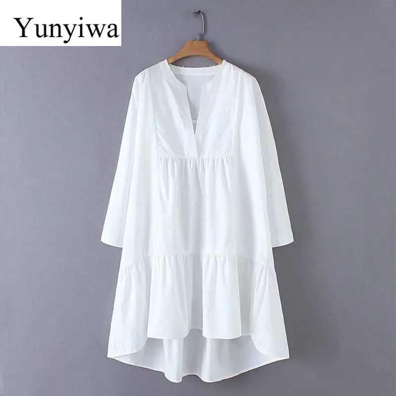 Новинка 2019, женское модное одноцветное платье трапециевидной формы с v-образным вырезом и асимметричным подолом, женское милое повседневное белое платье с длинным рукавом