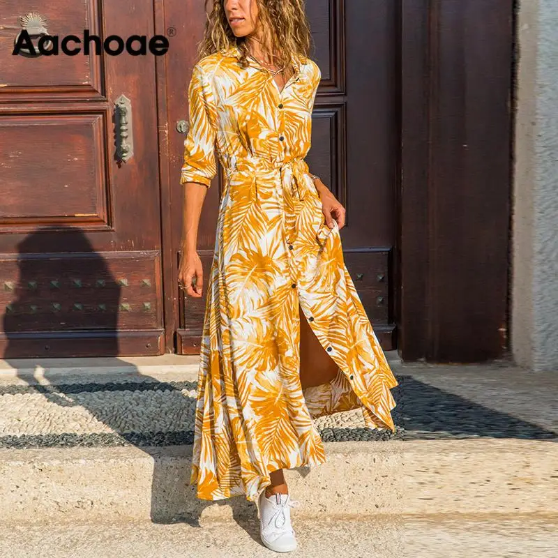 Женское длинное платье с принтом, осень-весна 2020, с длинным рукавом, на пуговицах, с разрезом, повседневное, с отложным воротником, женские пл...