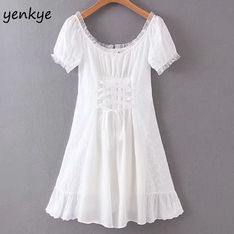 Модное женское сексуальное Белое Кружевное платье с открытыми плечами, романтичное Летнее мини-платье трапециевидной формы с короткими ру...