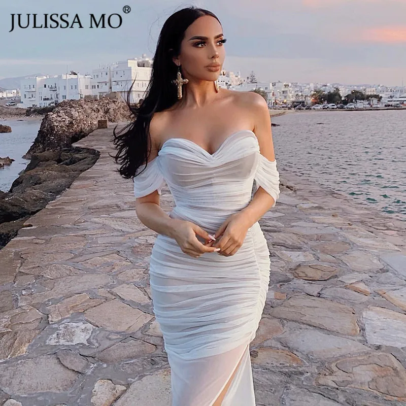 Julissa mo двойной сетки пикантные Длинные вечерние платья Для женщин с открытыми плечами облегающее летнее платье женское Красное атласное пл...