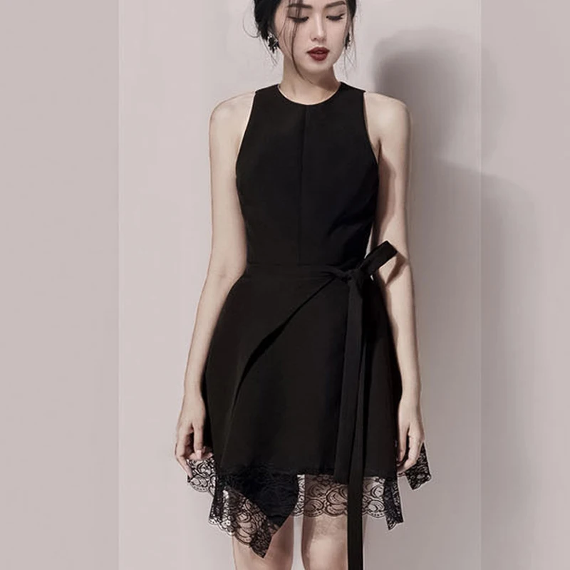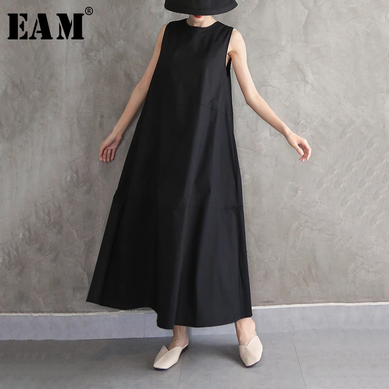 [EAM] женское черное короткое длинное платье с разрезом, новинка, круглый вырез, без рукавов, свободный крой, модный стиль, весна-осень 2020, 1N570