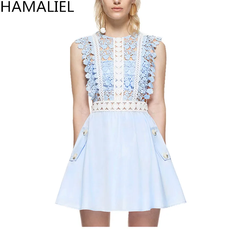 Новый Автопортрет летнее платье 2018 взлетно-посадочной полосы Для женщин синий Кружево Лоскутная выдалбливают рукавов пикантные Повседнев...