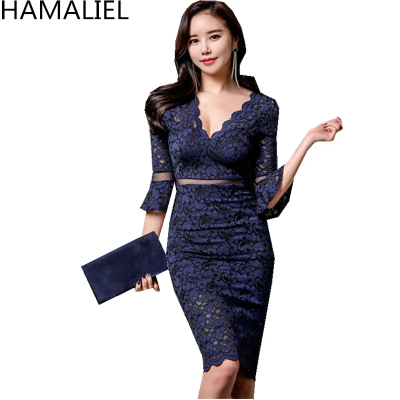 Hamaliel 2018 корейские летние Кружево лоскутное ажурное платье-футляр Для женщин синий Сексуальная V Средства ухода за кожей шеи Bodycon выдалблива...