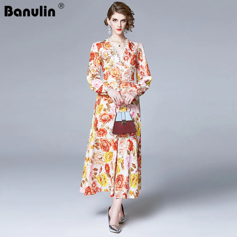 Женское праздничное длинное платье Banulin, весеннее однобортное длинное платье макси с цветочным принтом и пышными рукавами, новинка 2020