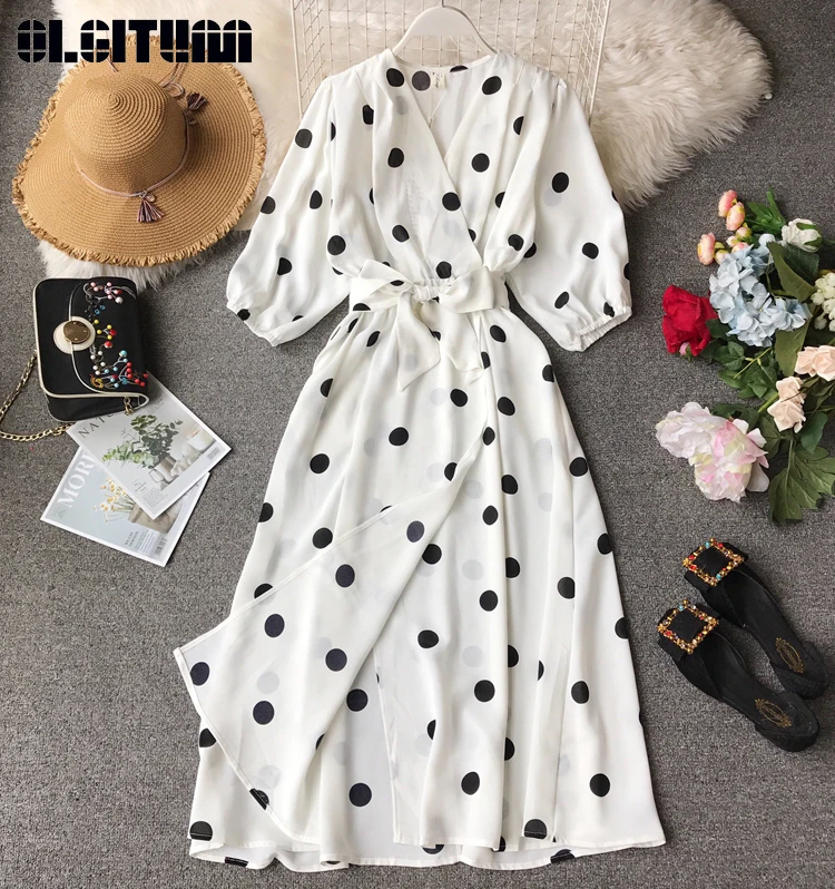 Винтажное платье женское платье в горошек лето 2019 праздничное платье с v-образным вырезом и пышным рукавом, тонкое женское пляжное платье тр...