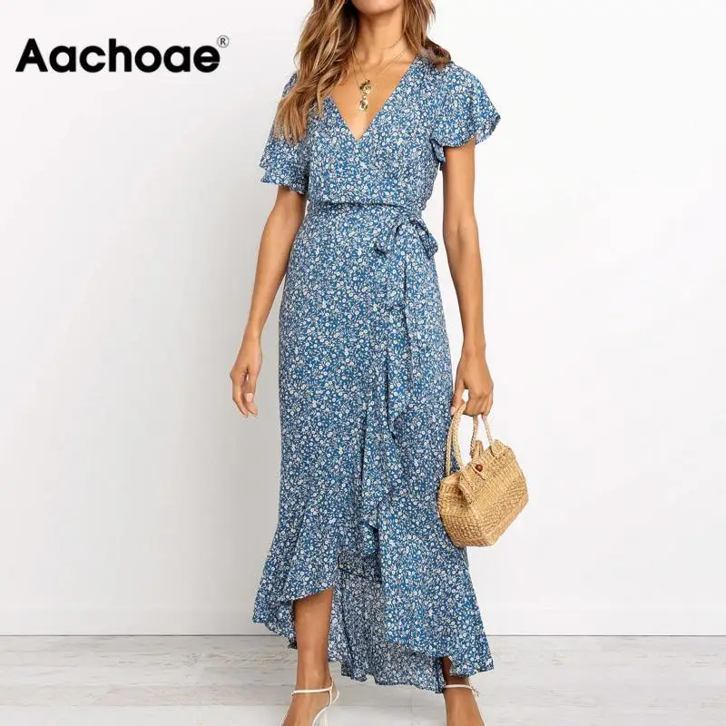 Длинное Платье Макси женское летнее богемная накидка с цветочным принтом пляжное платье сексуальное с v-образным вырезом Сплит с коротким р...