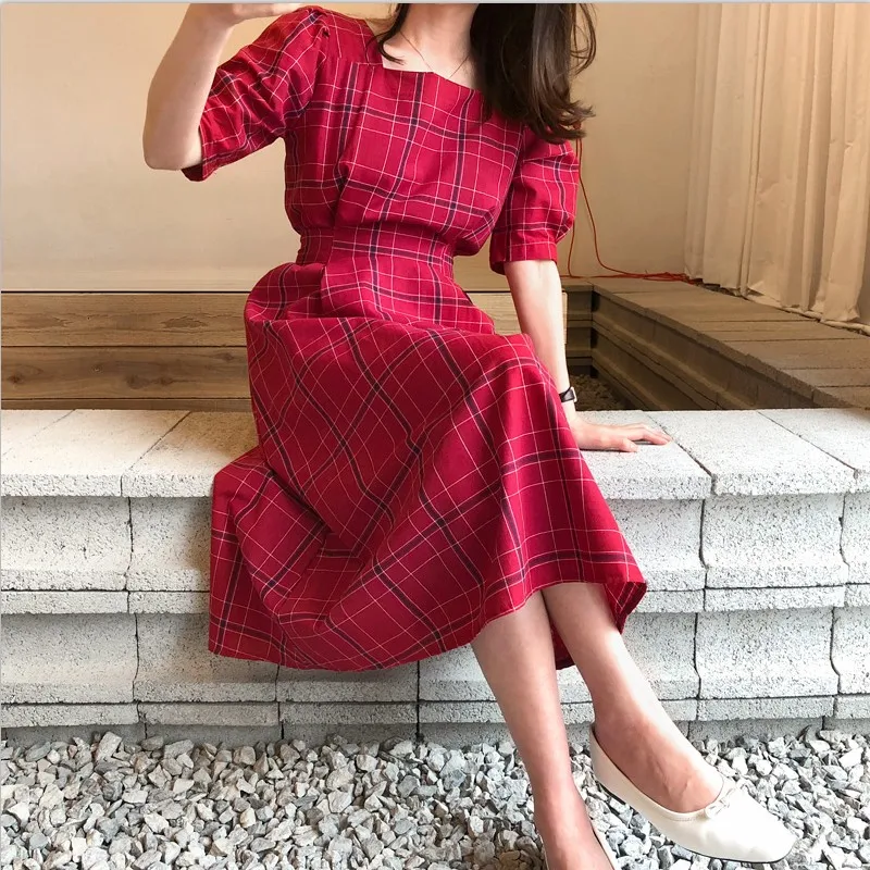 Новое летнее платье Для женщин туфли из хлопка и льна ПР Повседневное с коротким рукавом платья Женское платье квадратный В красную клетку платье Boho роковой