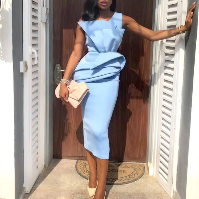 Синее вечернее платье миди без рукавов с баской и оборками для женщин для особых случаев, платья-карандаш для мероприятий, праздников, праздников, женщин, лето