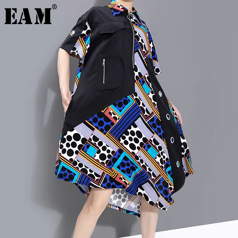 Женское платье-рубашка EAM, черное платье с принтом и коротким рукавом, с отворотом, весенне-летняя мода 2020 1W005