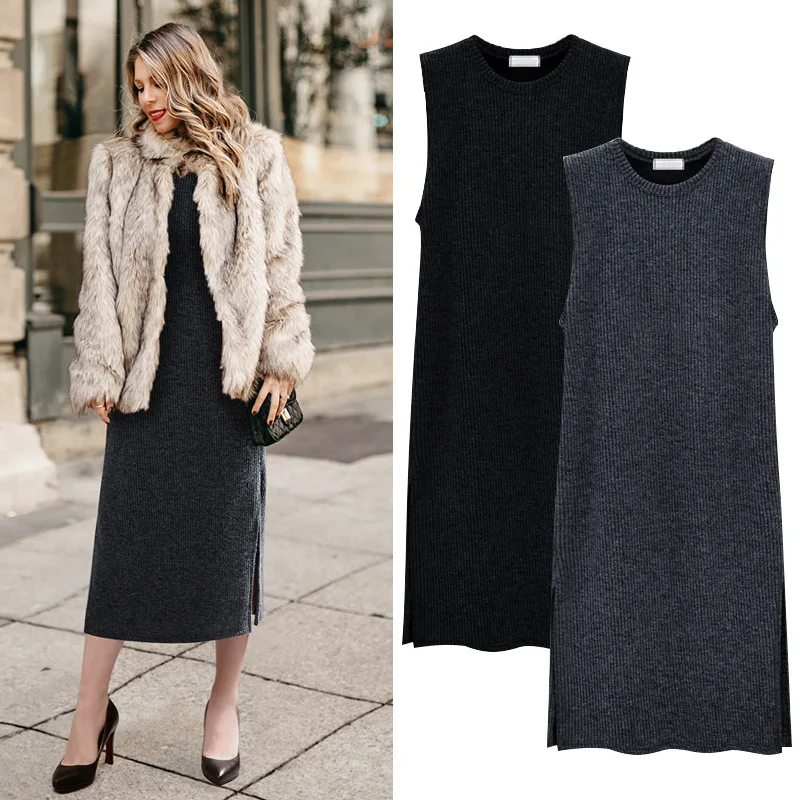 Плюс размеры для женщин Вязание стрейч свитер платье без рукавов 2018 зимние женские платья vestido костюмы халаты с круглым вырезом OVL1020