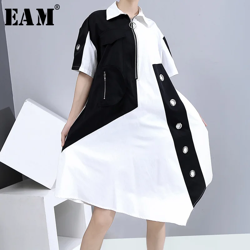 Женское Ассиметричное платье EAM, платье-рубашка большого размера с отложным воротником и коротким рукавом, весна-лето 2020, 1U647