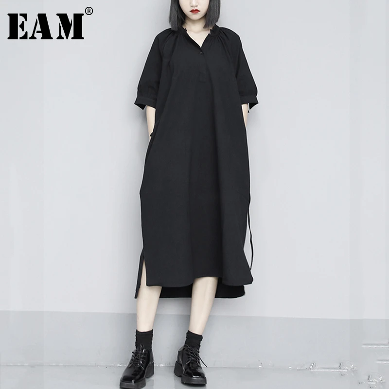 [EAM] женское черное короткое асимметричное платье большого размера, новинка, v-образный вырез, рукав до локтя, свободный крой, мода, весна-лето 2020, 1S402