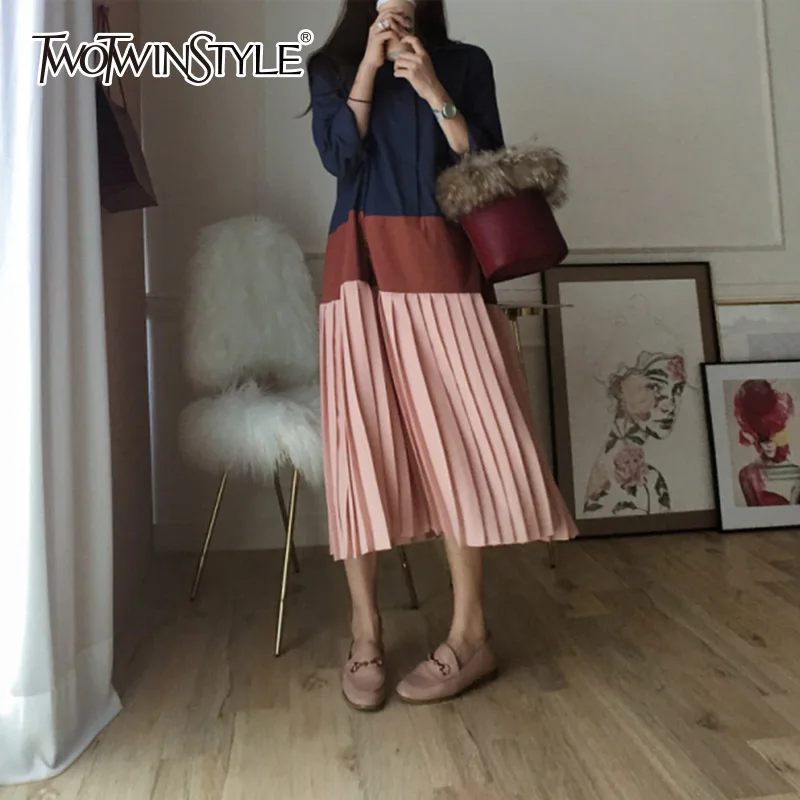 TWOTWINSTYLE платье В лоскутном стиле женский воротник с лацканами большой размеры миди длинные плиссированные платья для женщин 2018 Весенняя мод...