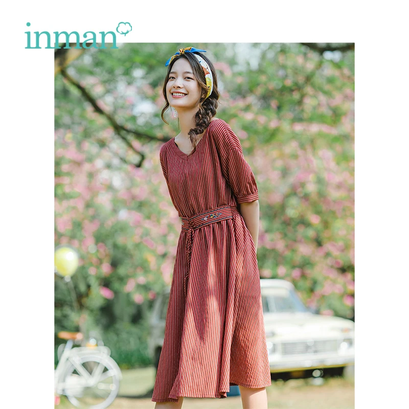 Инман 2019 Новое поступление; Летнее v-образным вырезом литературный вышивка полосатый подчеркивающий талию обтягивающая с короткими рукава...