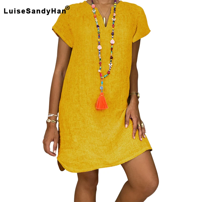 Женское платье с коротким рукавом, платье из хлопка и льна с треугольным вырезом, весеннее/летнее, 2020