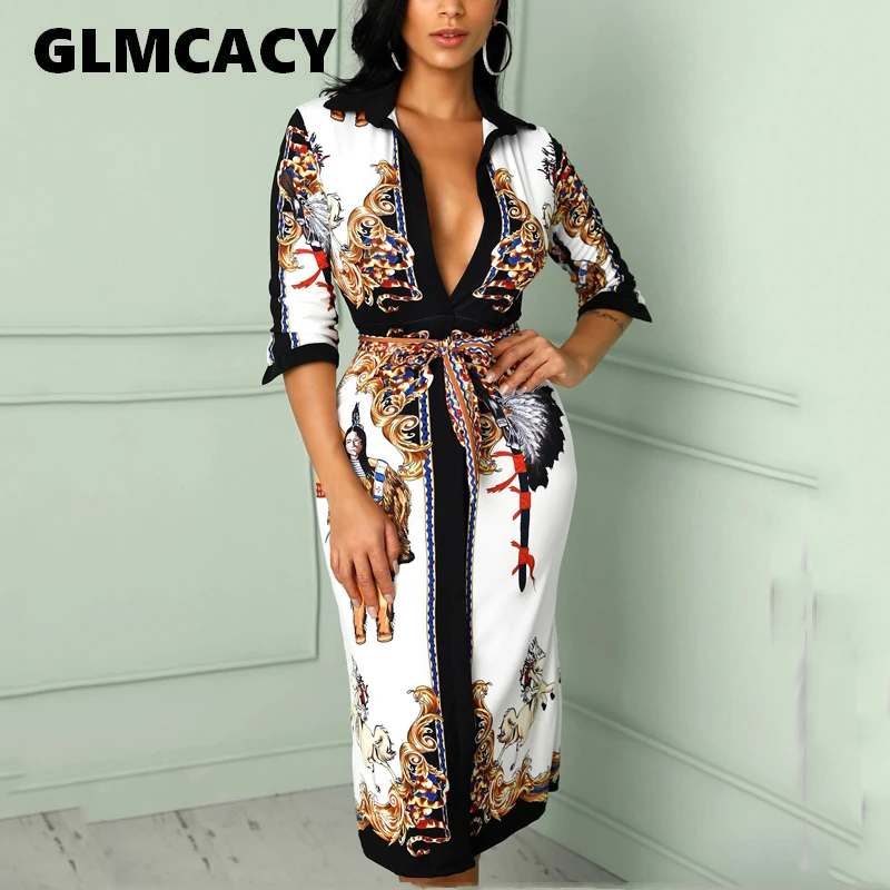 Для женщин V шеи шарф принтом и поясом Обёрточная бумага Повседневные платья 2019 Весна с рукавом 1/2, для вечеринок миди-платье отпуск женские ...
