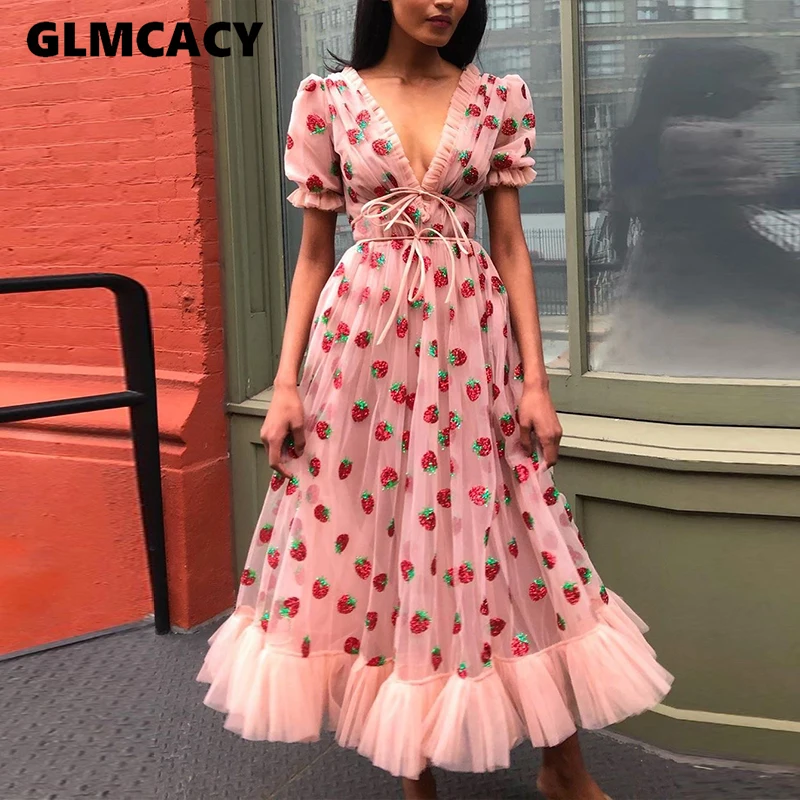 Женское кружевное платье с вышивкой клубники и Каскадными рюшами, с v-образным вырезом, с коротким рукавом, милые праздничные платья макси