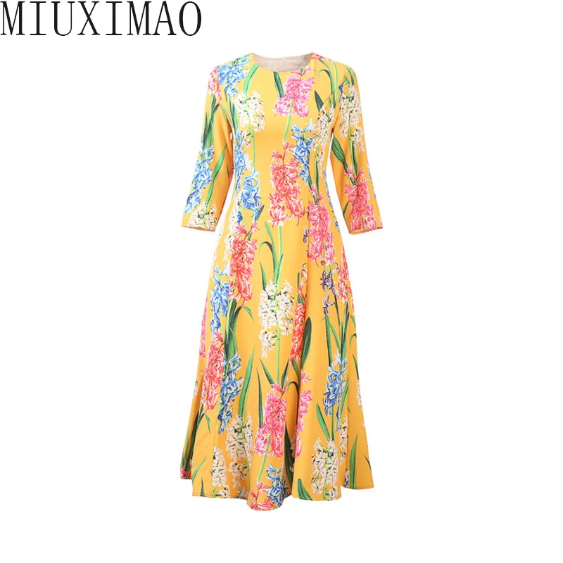 Высокое качество, осень 2020, Новое поступление, модное элегантное осеннее платье до середины икры на молнии с круглым вырезом и цветочным принтом