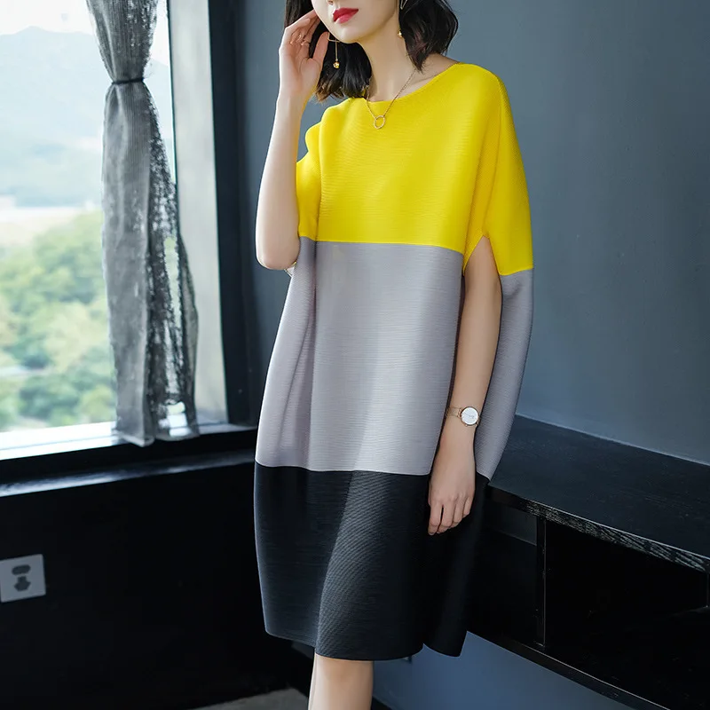 LANMREM 2019 Весна Новый плиссированная ткань с круглым вырезом рукав "летучая мышь" лоскутное цвет Дамская мода свободные раза платье BA682