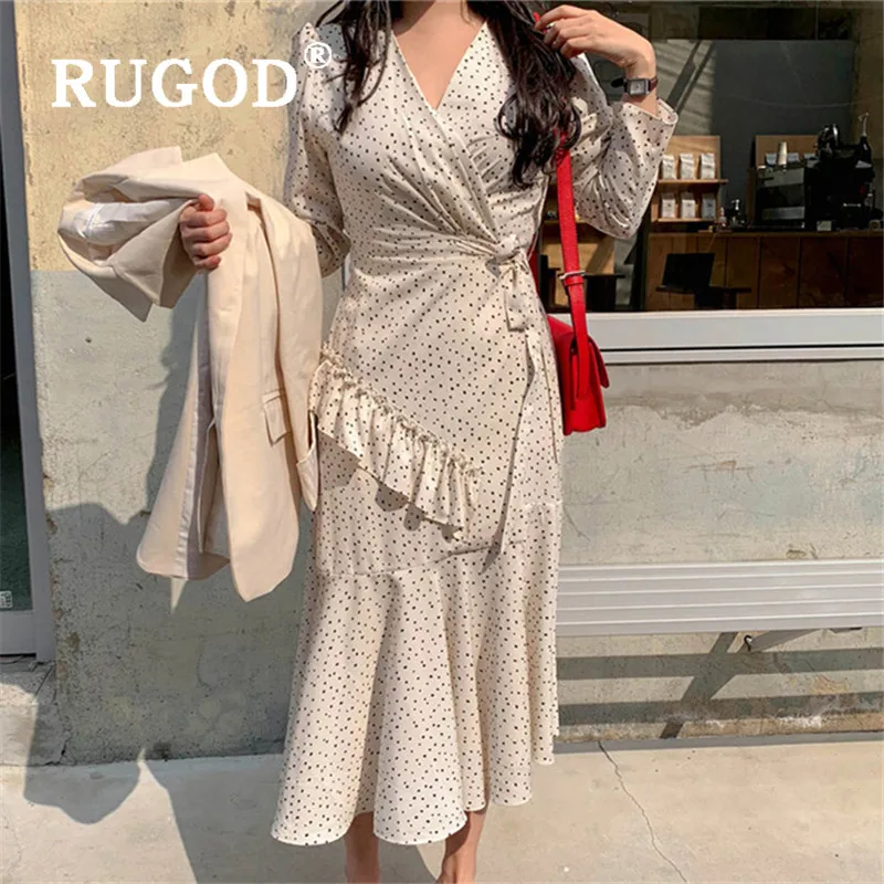 RUGOD 2020 Новая мода весеннее женское платье темперамент v-образным вырезом Polk точка Высокая талия с длинным рукавом оборками платья элегантные женские
