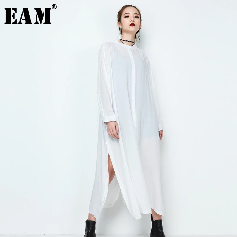 [EAM] 2019 весенне-летнее женское стильное Новое черно-белое однобортное длинное платье с длинным рукавом с разрезом по низу JE64701