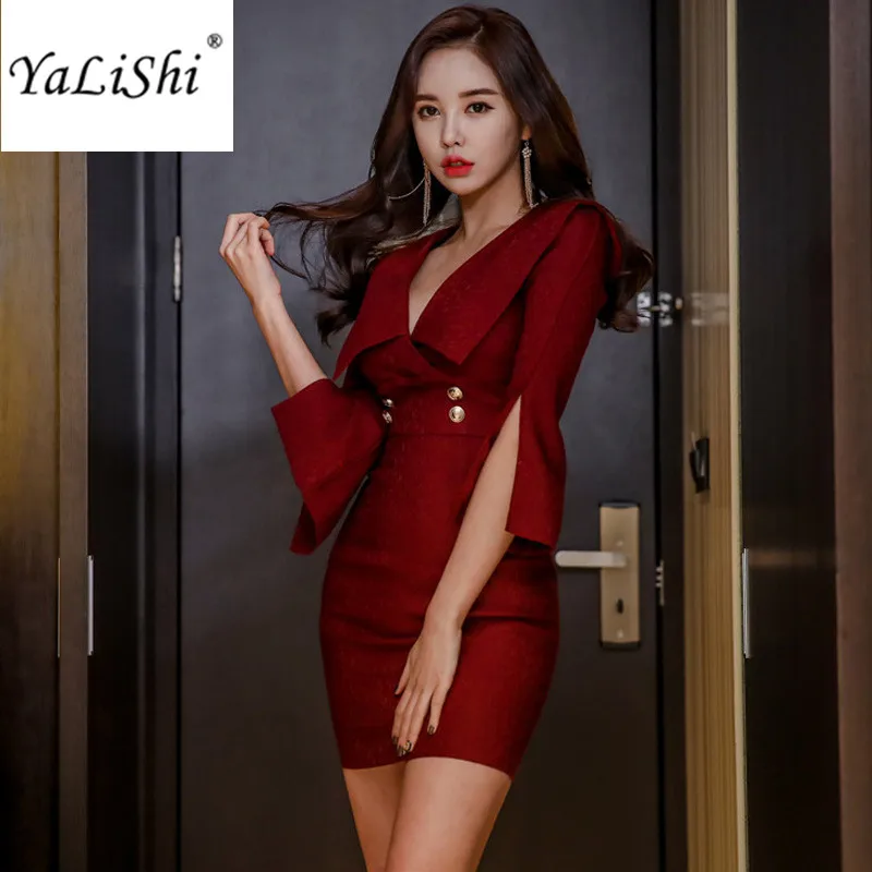 2018 весенние платья красные с расклешенными рукавами v-образный вырез женское платье офис Бандажное облегающее винтажное сексуальное Вечер...
