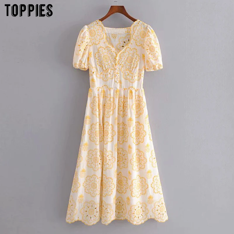Toppies винтажное желтое мини-платье с вышивкой, женское Хлопковое платье с коротким рукавом, высокое качество, vestidos