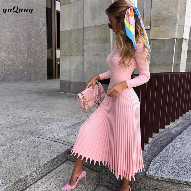 Yuqung женское трикотажное длинное платье-свитер, Осень-зима, женские офисные платья в рубчик, теплые плиссированные платья с длинным рукавом, трикотаж