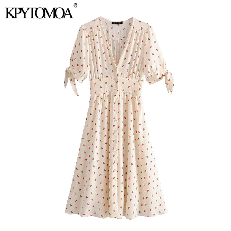 Винтаж Chic вишни шаблон кнопки платье миди Для женщин 2019 Мода v-образным вырезом с завязками и рукавом женские платья повседневные платья Mujer