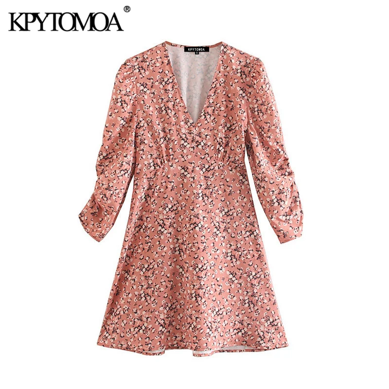 Винтажное элегантное мини-платье с цветочным принтом для женщин 2019, модные эластичные платья с v-образным вырезом и рукавом три четверти сза...