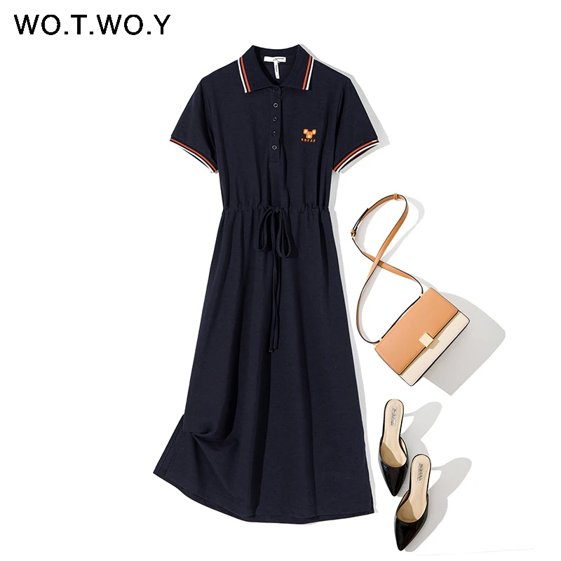 WOTWOY Funny Embroidery Casual Polo Dress Women Plus Size Summer Split Long Dresses Women Solid Loose Cotton Dress Female 3XL