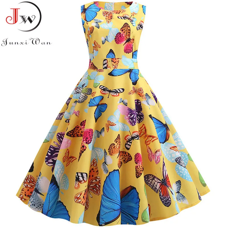 Винтажное платье в стиле рокабилли с принтом бабочек; модель 2019 года; Летние праздничные платья без рукавов трапециевидной формы; халат Femme ...