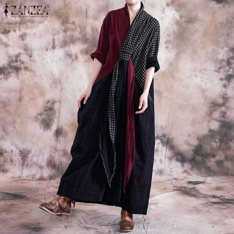 Весенне-осенний сарафан размера плюс, женское Повседневное платье с длинным рукавом в винтажном стиле, вечерние платья в клетку, длинное пл...