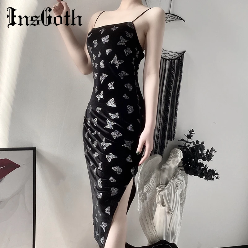 InsGoth облегающее длинное платье на бретельках, женское сексуальное платье без рукавов с разрезом, с открытой спиной, с принтом бабочки, вечернее платье, женское Макси-платье