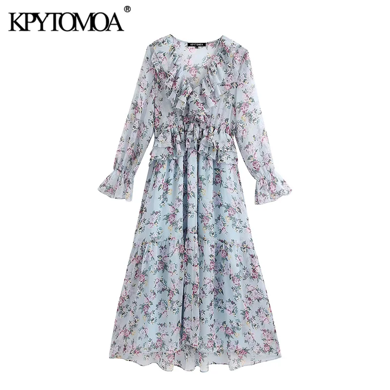 KPYTOMOA женское 2020 шикарное модное винтажное платье с цветочным принтом и оборками-миди с длинным рукавом прозрачные женские платья Vestidos Mujer