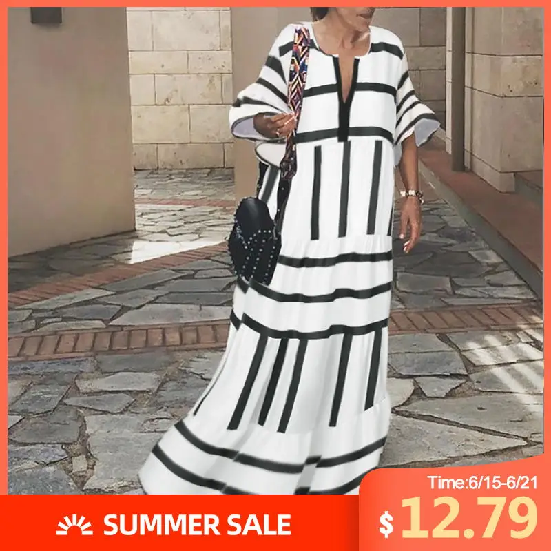 VONDA сексуальное винтажное платье с v-образным вырезом женское богемное длинное платье с коротким рукавом повседневное свободное пляжное ве...