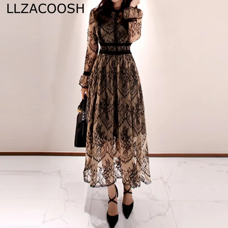 Весна 2020, сексуальное длинное платье, тонкое лоскутное платье с длинным рукавом, до середины икры, ажурное кружевное вечернее платье, Vestidos Robe Femme