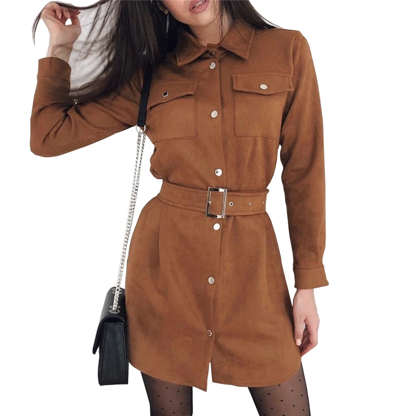 TAOVK осеннее женское одноцветное однобортное Замшевое платье с отложным воротником и длинным рукавом с поясом