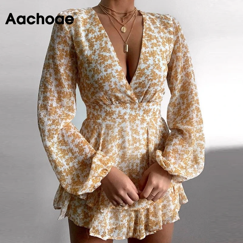 Aachoae, сексуальное пляжное шифоновое платье с глубоким v-образным вырезом и принтом, женское летнее мини-платье с длинным рукавом, сарафан, праздничные вечерние платья, Vestidos