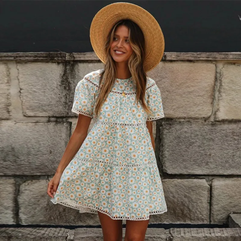 Женское открытое мини-платье с принтом маргаритки, с круглым вырезом, с коротким рукавом, женские платья в стиле бохо, 2020, Летние повседневные женские пляжные платья