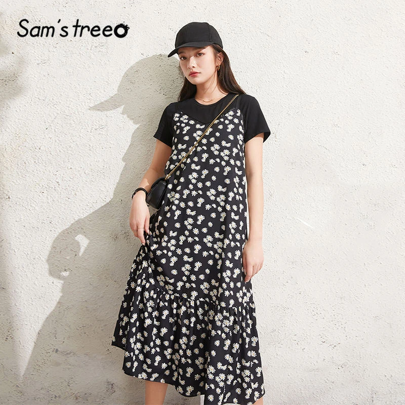 Женское атласное платье средней длины SAM'S TREE, с высокой талией и цветочным принтом, весна 2020, новое корейское праздничное платье с коротким рукавом