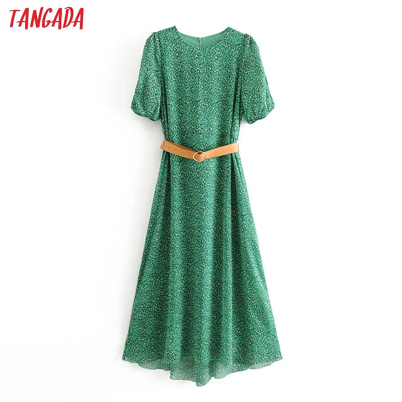 Tangada fashion women leopard print green dress with belt 2020 new arrival Long Sleeve Ladies chiffon midi Dress 6A09