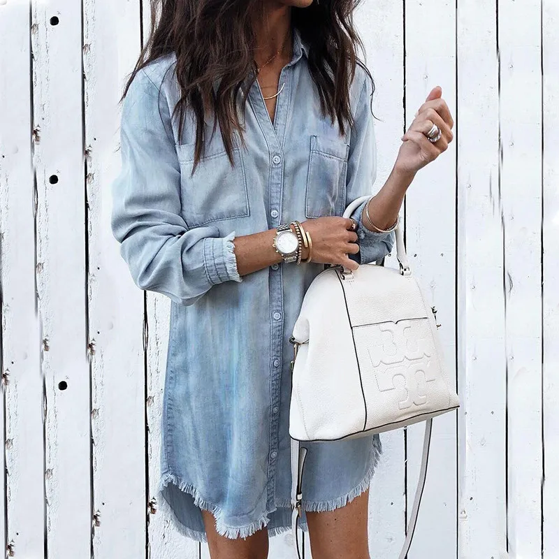 Женское повседневное джинсовое платье-рубашка с длинным рукавом и v-образным вырезом, мини-платье с карманами для офиса, летнее свободное платье