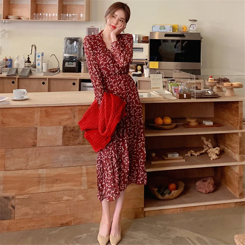 BGTEEVER Винтаж Цветочный Принт v-образный вырез женское платье Стильный полный рукав А-силуэт шикарное женское шифоновое платье 2019 женское мид...