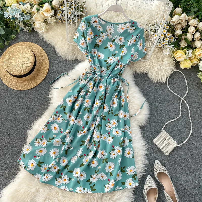 2020 винтажное шифоновое платье с v-образным вырезом и цветочным принтом, летние вечерние платья средней длины с длинным галстуком и высокой т...
