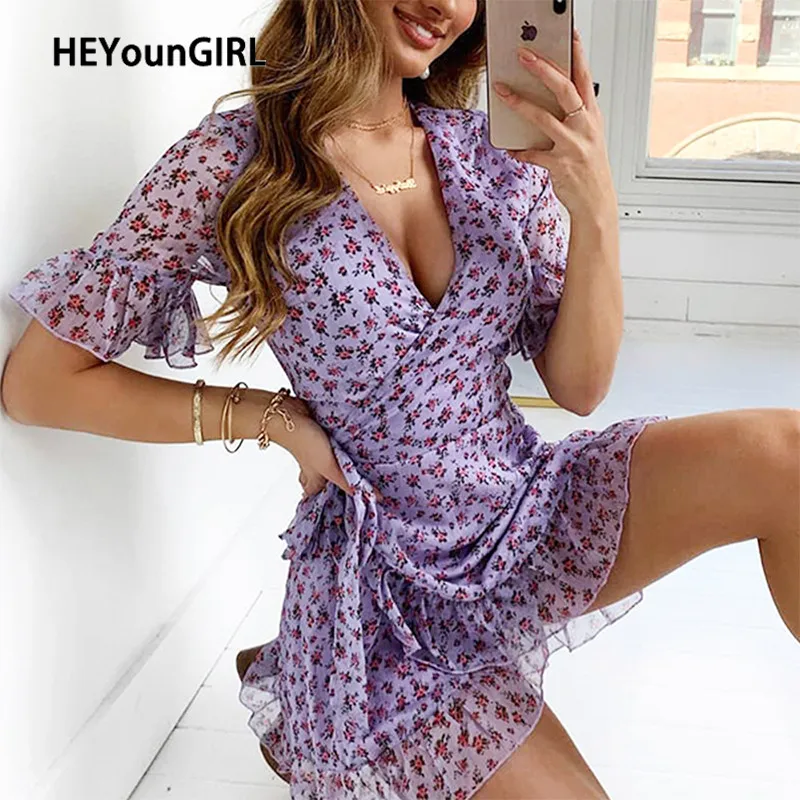 HEYounGIRL летнее асимметричное свободное платье с оборками, женское короткое платье с глубоким v-образным вырезом и коротким рукавом, женское короткое платье с цветочным принтом