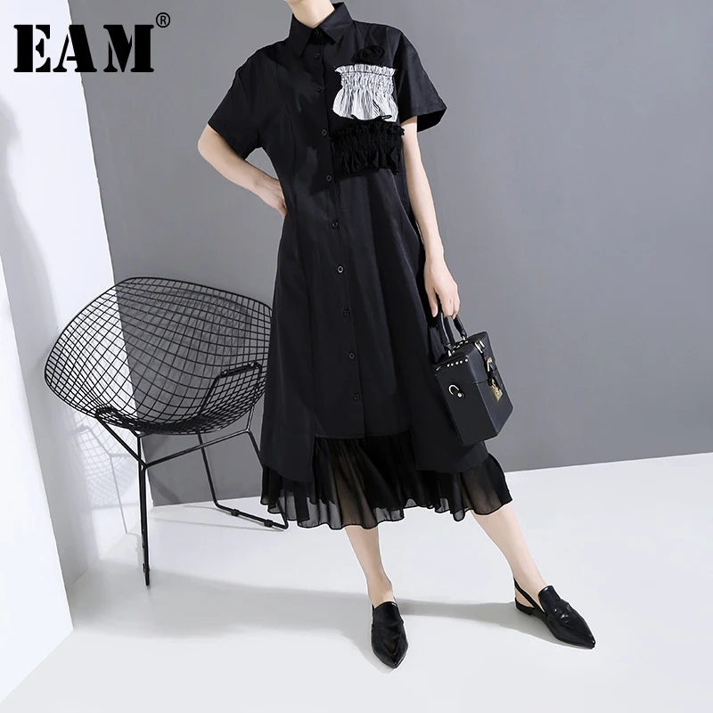 Женское платье-рубашка EAM, черное плиссированное платье большого размера с коротким рукавом и отложным воротником, весенне-летняя мода 2020 1U503