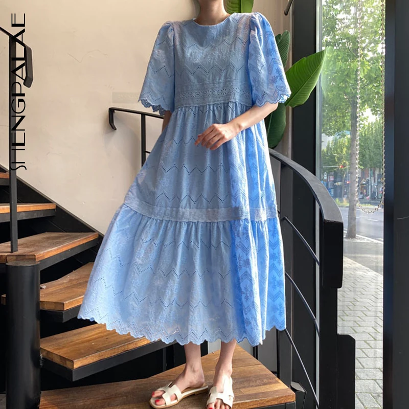 SHENGPALAE 2020 New Summer Women Vintage Loose High Waist Slim Was Thin Elegant Hollow Out Embroidery Maxi Dress ZA4452